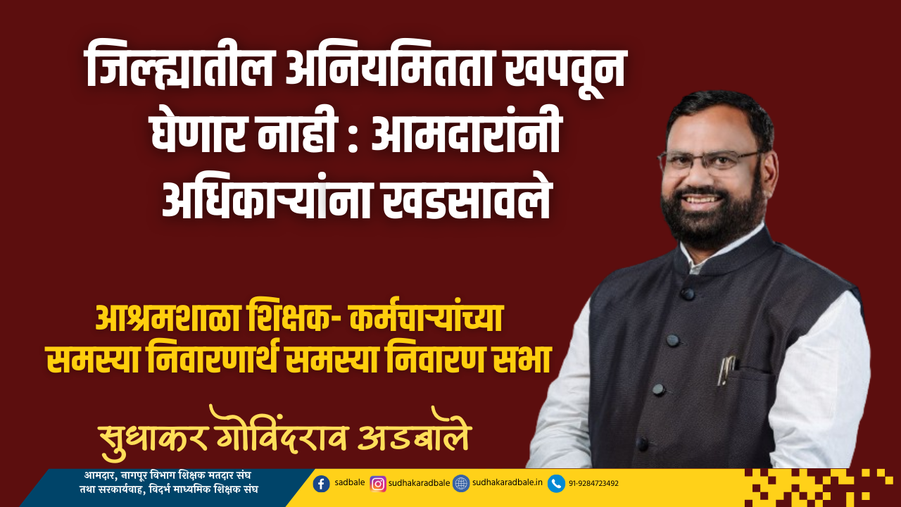 जिल्ह्यातील समायोजन प्रक्रियेत फार मोठा घोळ असून १८ अतिरिक्त शिक्षकांपैकी ५ शिक्षक हे समायोजित शाळेत रुजू झालेच नाही तर २ शिक्षकांना संस्थांनी रुजू करून घेतले नाही. शासन परिपत्रक दिनांक ८ मार्च २०१८ नुसार समायोजित शिक्षकांनी १५ दिवसात समायोजित शाळेत रुजू न झाल्यास सेवेतील हक्क संपुष्टात येतो. ३ महीने कालावधी झाला तरी हे शिक्षक रुजू झाले नाही. मात्र, या शिक्षकांवर कोणतीही कारवाई न करता अधिकार्‍यांनी त्यांना पाठीशी घातले असून त्यांच्या कार्यप्रणालीवर संशय व्यक्त होत आहे. शिक्षक रुजू न झाल्याने विद्यार्थ्यांचे फार मोठे शैक्षणिक नुकसान होत आहे व शासनास या अतिरिक्त शिक्षकांच्या वेतनाचा आर्थिक भुर्दंड सहन करावा लागत आहे. आदेशाचे पालन न करणार्‍या शिक्षकांना तात्काळ समायोजित शाळेत रुजू होण्याच्या सूचना आमदार महोदयांनी केल्या असून जिल्ह्यात कोणतीही अनियमितता खपवून घेणार नाही, असे खडे बोल आमदार सुधाकर अडबाले यांनी सहा. संचालकांना सुनावले.