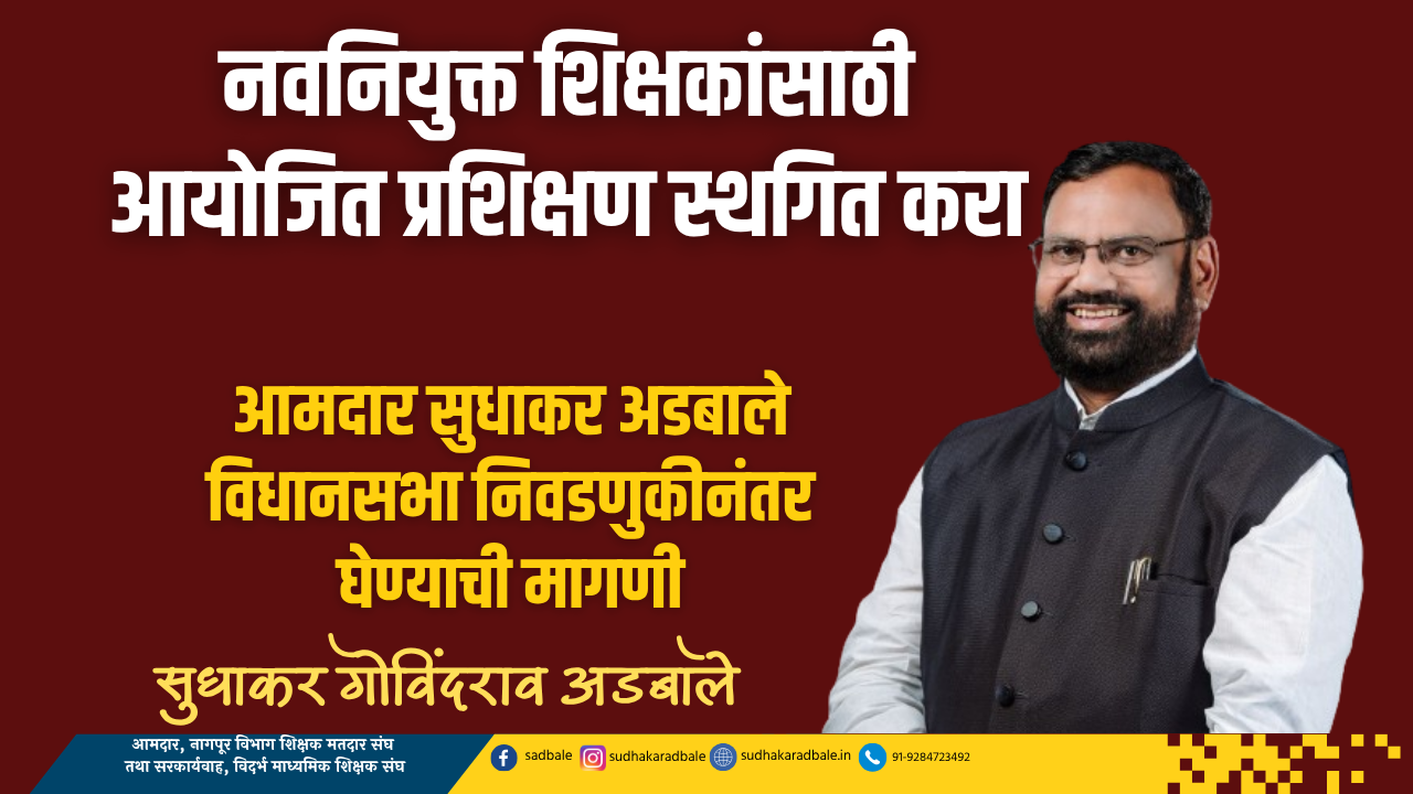 सदर कालावधीमध्ये दिवाळीच्या सुट्ट्या आहेत. त्यामुळे अनेक शिक्षक बाहेरगावी जात असतात. तसेच या कालावधीदरम्यान विधानसभेची निवडणूक आहे. या विधानसभा निवडणुकीसाठी शिक्षकांच्या ड्युट्या सुद्धा लागलेल्या आहेत. अशावेळी सदर प्रशिक्षण योग्यरित्या होणे शक्य नाही. त्यामुळे हे प्रशिक्षण तात्पुरते स्थगित करून विधानसभा निवडणुकीनंतर घेण्यात यावे, अशी मागणी आमदार सुधाकर अडबाले यांनी राज्य शैक्षणिक संशोधन व प्रशिक्षण परिषद, पूणेचे संचालक, प्रधान सचिव, आयुक्त (शिक्षण), संचालक (प्राथ./माध्य/उच्च माध्य.) यांच्याकडे केली आहे.